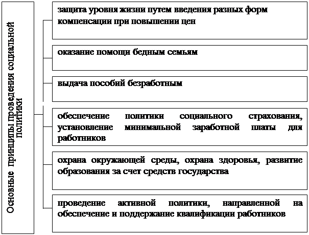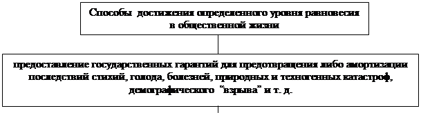 Рисунок 1 - Способы достижения равновесия в общественной жизни Социальная сфера, в рамках которой удовлетворяются прямые жизненные потребности членов общества, охватывает многие стороны человеческого бытия. Ключевым моментом её развития является повышение жизненного уровня людей. При обосновании перспектив социального развития и повышения народного благосостояния следует исходить из приоритета социальных процессов в общественном воспроизводстве. Центр тяжести переносится с достижения целевых показателей доходов, потребления, обеспеченности теми или иными благами на создание адекватных современному этапу социальных механизмов общественного воспроизводства. Переориентация социальной политики с обеспечения определенного уровня благосостояния на выполнение конструктивных воспроизводственных функций усиливает социальную направленность развития производства. Данная тактика позволяет поставить уровень и динамику благосостояния и объёма потребительских ресурсов в зависимость от утверждения принципов распределения, социальной справедливости, создание лучших возможностей для развития и реализации способностей личности. Ключевой проблемой социального развития в этой связи является обеспечение ориентации всех структурных звеньев системы управления экономикой на приоритет социальных критериев эффективности. Система хозяйствования и соответствующая экономическая политика, способствующие процессу развития предпринимательской деятельности и создающие тем самым дополнительные рабочие места, ведут к увеличению производства и соответственно к более высоким доходам, повышению уровня потребления. В идеальном случае вследствие полной занятости, стабильности цен для каждого желающего и способного работать создаются условия, которые позволяют ему на основе своих дифференцированных доходов, зависящих от производительности, удовлетворять потребности, а также заботиться старости. Малообеспеченным и социально незащищённым группам, которые не в состоянии получать самостоятельно доход, необходима поддержка и помощь общества, в том числе со стороны государственных структур. Социально ориентированное общество несёт ответственность за более слабых своих представителей. Социальная политика Республики Казахстан сосредоточена на проблеме повышения благосостояния граждан. Основные принципы проведения социальной политики представлены на рисунке 2.