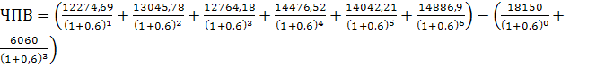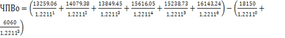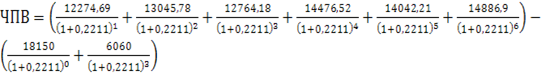 = А5 =(6060 – (6060*0,57))+2636,25=4122,3 А6 = ((6060 – (6060*0,57))*0,57)+2636,25=3751,97 3. Оподатковуваний прибуток = Виручка-Експлуатаційні витрати-Амортизація ОП1 = 20562,5–5075–2636,25=12851,25 ОП2 = 21590,63–5075–2636,25=13879,38 ОП3 = 22670,16–6530–2636,25=13503,91 ОП4 = 23803,66–6530–6085,08=11188,59 ОП5 = 24993,85–7645–4122,3=13226,54 ОП6 = 26243,54–7645–3751,97=14846,57 4. Податок на прибуток = Оподатковуваний прибуток*25% ПП1 =12851,25*0,25=3212,81 ПП2 =13879,38*0,25=3469,84 ПП3 =13503,91*0,25=3375,98 ПП4 =11188,59*0,25=2797,15 ПП5 =13226,54*0,25=3306,64 ПП6 =14846,57*0,25=3711,64 5. Чистий прибуток = Оподатковуваний прибуток-Податок на прибуток ЧП1 =12851,25–3212,81=9638,44 ЧП2 =13879,38–3469,84=10409,53 ЧП3 =13503,91–3375,98=10127,93 ЧП4 =11188,59–2797,15=8391,44 ЧП5 =13226,54–3306,64=9919,91 ЧП6 =14846,57–3711,64=11134,93 6. Чистий грошовий потік від операційної діяльності = ЧП+А ЧГП1 = 9638,44+2636,25=12274,69 ЧГП2 = 10409,53+2636,25=13045,78 ЧГП3 = 10127,93+2636,25=12764,18 ЧГП4 = 8391,44+6085,08=14476,52 ЧГП5 = 9919,91+4122,3=14042,21 ЧГП6 = 11134,93+3751,97=14886,9 9. Чистий грошовий потік від інвестиційної та операційної діяльностей = ЧГП-Грошовий відтік+Грошовий потік ЧГПІД1 = 12274,69 ЧГПІД2 = 13045,78 ЧГПІД3 = 12764,18–6060+800 = 7504,18 ЧГПІД4 = 14476,52 ЧГПІД5 = 14042,21 ЧГПІД6 = 14886,9+2817,3=17704,2 10. Кумулятивний чистий грошовий потік від інвестиційної та операційної діяльностей розраховується за методом «Ялинки», наприклад: КЧГП1 = ЧГП від інвест. та опер. діяльн.0 + ЧГП від інвест. та опер. діяльн.1 КЧГП2 = КЧГП1 + ЧГП від інвест. та опер. діяльн.2 Наступні роки розраховуються аналогічно: КЧГП1 = -18150–12274,69 = -5875,31 КЧГП2 = -5875,31+13045,78 = 7170,47 КЧГП3 = 7170,47+7504,18 = 14674,65 КЧГП4 = 14674,65+14476,52 = 29151,17 КЧГП5 = 29151,17+14042,21 = 43193,38 КЧГП6 = 43193,38+17704,2 = 60897,57 11. Дисконтований грошовий потік від інвестиційної та операційної діяльностей = ЧГП від інвест. та опер. діяльн./(1+і) t де і – ставка дисконтування, що розраховується за формулою: Спочатку у розрахунках враховується інфляція: