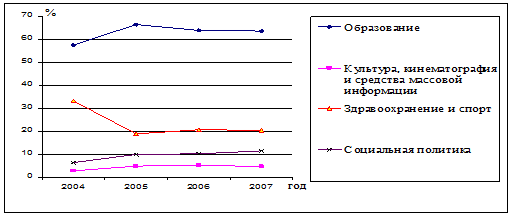По данным таблицы 2 видно, что наибольший удельный вес в общей сумме расходов бюджета МО «Город Калуга» приходится на финансирование отраслей социально – культурной сферы: образования, здравоохранения и спорта, культуры и искусства, социальной политики. Следует отметить, что показатели бюджета муниципального образования «Город Калуга» по расходам на финансирование отраслей социально-культурной сферы обеспечивают основные гарантии медицинского, социального обслуживания населения, образования и культуры, оказания поддержки наименее обеспеченным гражданам. В 2004 году сумма запланированных расходов на финансирование отраслей социально-культурной сферы составляла 1 246492 тыс. руб. или 62,3% в общей сумме расходов, в 2005 году – 1 491554 тыс. руб. или 65,6% в общей сумме расходов, в 2006 году – 1858652 тыс. руб. (68,8% в общей сумме расходов), в 2007 году –2 201813 тыс. руб. (58,2% в общей сумме расходов), а на 2008 год запланирована в размере 2 943513, что составит 65,1% в общей сумме расходов. Также из таблицы 2 видно, что расходы на финансирование отраслей социально-культурной сферы в целом имеют тенденцию к росту. Небольшой спад отмечен в 2007 году, но в планируемом году ориентация на увеличение, в среднем за три года их доля в общей сумме расходов составляет более 60%. Это говорит о преимущественно социальной направленности бюджетной политики муниципального образования «Город Калуга». Первое место в финансировании отраслей социально – культурной сферы по размеру средств занимает статья «Образование», на ее долю приходиться более 30%, на втором – «Здравоохранение и спорт», ее размер колеблется до 21%, также отметим, что наблюдается снижение удельного веса в общем объеме расходов. В 2004 году составил 20,7%, а в 2008–10,2%, что в 2 раза меньше. Третье место – статье «Социальная политика», статья «Культура и СМИ» в десятки раз меньше первых двух, но по ней наблюдается рост: 2004 году – 1,8%, в 2006 увеличилась в 2 раза, а в2008 ожидается увеличение по сравнению с предыдущим лишь на 1%. (рис. 3)