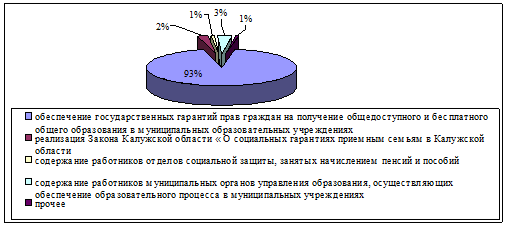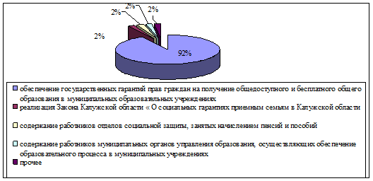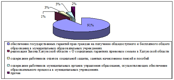 Рис. 9. Структура средств, предназначенных для реализации государственных полномочий в 2004 году Из рисунка 6 видно, что наибольший удельные вес в объеме средств переданных для реализации государственных полномочий приходился на обеспечение государственных гарантий прав граждан на получение общедоступного и бесплатного общего образования в муниципальных образовательных учреждениях – 91% от общего объема всех средств. Статьей 21 Закона Калужской области «Об областном бюджете на 2005 год» установлено, что финансирование государственных полномочий осуществлялся органами местного самоуправления Калужской области за счет целевых субвенций из областного бюджета. (рис. 10.)