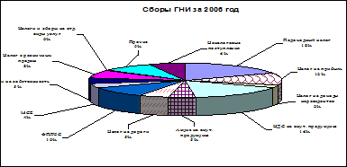 Снижение доли косвенных налогов в 2001 году на 4,6 % и в 2002 году на 2,6 %, по сравнению с предыдущими годами, еще ни о чем не говорят, так как, поступления НДС в абсолютной сумме неуклонно растет с каждым годом. Начиная с 2003 года до 2006 года НДС увеличился, в 2002 году он снизился и составил 38%. В 2003 году НДС составил 39%, а в 2004 году он увеличился на 7% и составил 46%.Это был самый высокий показатель, начиная с 1991 год Данная таблица свидетельствует о значимости НДС на сегодняшнем этапе развития экономики. Его доля за анализируемый период остается одной из самых значительных источников поступлений финансовых ресурсов страны Фактические поступления подоходного налога за 2006 год составили 1820,3 млн.сом или 103,0% от установленного плана. По сравнению с прошлогодним показателем сборы увеличились на 76,1 млн. сом или на 4,4%. Доля данного налога к ВВП составила 1,6 процента. Сборы подоходного налога, удерживаемого работодателями, составили 1373,7 млн. сом, по сравнению с аналогичным периодом 2005 года сборы увеличились на 29,7 млн. сом, что обусловлено увеличением реального уровня средней заработной платы на 11,9 % (источник – данные НСК за 2006 год). Подоходный налог, взимаемый налоговыми органами, составил 43,5 млн. сом, что по сравнению с прошлогодним периодом больше на 4,1 млн.сом или на 10,3%. Сборы подоходного налога, взимаемого на патентной основе, составили 378,0 млн.сом или 112,5% от уровня прошлогодних сборов. За 2006 год выдано 684643 патентов, что по сравнению с прошлым годом больше на 75336 патента или на 12,4 процентов. Наибольший удельный вес по патентам, выданным физическим лицам по сферам предпринимательской деятельности приходится на производство и реализацию товаров народного потребления и продовольственных товаров – 61,9%, на бытовое обслуживание населения – 18,6%, другие виды деятельности – 15,3%. По сравнению с 2005 годом отмечен рост поступлений платы за патент в сфере производства и реализации товаров народного потребления и продовольственных товаров на 30,3 млн. сом, платы за патент в сфере бытового обслуживания на 6,9 млн. сом, в социально-культурной сфере на 0,5 млн. сом, в сельскохозяйственной сфере на 0,4 млн. сом. Вместе с тем, наблюдается снижение поступлений в других видах деятельности на 4,2 млн.сом. Поступления налога на прибыль за 2006 год составили 1191,6 млн.сом или 101,7% от планового уровня. Доля к ВВП данного налога составила 1,1%. Диаграмма 2.1.Сборы ГНИ за 2006 год