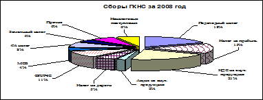 Фактические поступления подоходного налога с физических лиц - резидентов Кыргызской Республики за 2008 год3373,5 млн.сом или 102,8% от установленного плана. По сравнению с прошлогодним показателем сборы увеличились на 1056,1 млн. сом или на 45,6%. Доля данного налога к ВВП увеличилась на 0,2 процентных пункта и составила 1,8 процента. Сборы подоходного налога, удерживаемого у источника дохода, составили 2657,9 млн. сом или 102,8% от планового уровня, по сравнению с 2007 годом увеличились на 816,5 млн. сом, что обусловлено увеличением реального уровня средней заработной платы на 8,8% (источник – данные НСК за 2008 год). Подоходный налог с индивидуальных предпринимателей, составил 62,0 млн. сом или 106,4% от прогноза в сумме 58,3 млн. сом, что по сравнению с прошлым годом больше на 15,3 млн. сом или на 32,7%. Сборы подоходного налога на патентной основе, составили 653,6 млн.сом или 102,6% при доведенном прогнозе 637,2 млн.сом, по сравнению с 2007 годом поступления увеличились на 224,3 млн.сом или на 52,2%. За 2008 год выдано 849046 патентов, что по сравнению с прошлым годом больше на 63022 патента или на 8,0 процентов. Наибольший удельный вес по патентам, выданным физическим лицам по сферам предпринимательской деятельности приходится на производство и реализацию товаров народного потребления и продовольственных товаров – 59,5%, на бытовое обслуживание населения – 18,6%, другие виды деятельности – 30,1%. По сравнению с 2007 годом отмечен рост поступлений платы за патент в сфере производства и реализации товаров народного потребления и продовольственных товаров на 165,3 млн. сом, платы за патент в сфере бытового обслуживания на 21,6 млн. сом, в социально-культурной сфере на 3,7 млн.сом, в сельскохозяйственной сфере на 2,0 млн.сом, в других видах деятельности на 29,1 млн.сом Диаграмма 2.3. Сборы ГКНС за 2008 год
