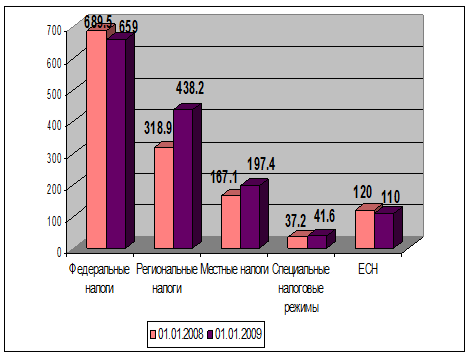 Рис. 5. Недоимка по федеральным, региональным, местным налогам и сборам, налогам со специальными налоговыми режимами и единому социальному налогу по состоянию на 01.01.2008 г. и 01.01.2009 г., млн. руб. |