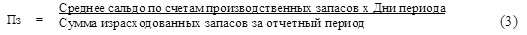 Период оборачиваемости капитала в запасах сырья и материалов равен времени хранения их на складе от момента поступления до передачи в производство. Чем меньше этот период, тем короче при прочих равных условиях производственно-коммерческий цикл (П3 ). Он определяется следующим образом: [10, c. 101]