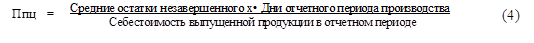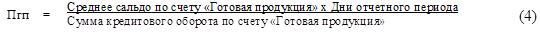 В данной организации продолжительность нахождения средств в процессе производства увеличилась по сравнению с прошлым годом на 3 дня. Необходимо проанализировать также продолжительность процесса производства по каждому виду продукции и установить факторы ее изменения. Период производственного цикла зависит от интенсивности, технологии, организации производства, материально-технического снабжения и других факторов. Его сокращение - признак повышения деловой активности организации. Продолжительность нахождения капитала в готовой продукции (ПГП ) равна времени хранения готовой продукции на складах от момента поступления из производства до отгрузки покупателям: [15, c. 45]