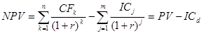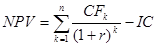 CFk – поступление в k-м базисном периоде (обычно, приток средств); IC – исходная инвестиция (отток средств); r – ставка дисконтирования, по которой элементы денежного потока будут приводиться к одному моменту времени. Этот метод основан на сопоставлении величины исходной инвестиции (IC) с суммой дисконтированных чистых денежных поступлений, генерируемых ею в течение прогнозируемого срока. Очевидно, что если: NPV > 0, проект принять следует; NPV < 0, не следует принимать проект; NPV = 0, в случае принятия проекта ценность компании не изменится. Если проект предполагает не разовую инвестицию, а последовательное инвестирование финансовых ресурсов в течение ряда лет, то формула для расчета NPV модифицируется следующим образом:
