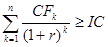 k – число периодов получения доходов; j – число периодов инвестирования средств в проект; ICd – дисконтированная сумма инвестиционных затрат. В данной курсовой работе инвестиции являются разовыми, поэтому будем использовать формулу (1). 2. Внутренняянормадоходности (Internal Rate of Return, IRR) IRR – это значение коэффициента дисконтирования r, при котором NPV проекта равен нулю. Если обозначить IC=CF0 , то IRR находится из уравнения: