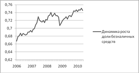рис. 1. Динамика роста доли безналичных средств. Если проанализировать средние значения роста доли по годам, то четко видна постоянная тенденция роста доли безналичных средств в общей денежной массе. Это означает, что расчету безналичными средствами отдают всё большее предпочтение по сравнению с расчетом наличными средствами.