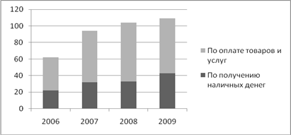 Рисунок 7. Сумма операций, совершенных держателями карт, юр. лицами, на территории России и за рубежом (млрд. руб.) В 2009 году держателями карт на территории России и за ее пределами было совершенно 674850 млрд. операций на сумму 2844 млн. руб. (темпы роста по сравнению с 2006 годом соответственно составили около 151% — по количеству операций и 147% — по объему). Физическими лицами в основном совершаются операции по получению наличных средств, а юридическими по оплате товаров и услуг. Начиная с 2006 года наметилась позитивная тенденция использования на территории России клиентами кредитных организаций — резидентов банковских карт в целях оплаты товаров (работ, услуг). Удельный вес количества безналичных платежей в общем количестве операций с картами вырос с 19% в 2006 году до 25% в 2009 году, а темпы прироста по количеству платежей ежегодно составляли более 55% (для сравнения: темп прироста по количеству операций по снятию наличных 41%), это говорит о том, что держатели карт стали их чаще использовать при совершении безналичных платежей. В то же время доля платежей, совершаемых с использованием карт в сети Интернет от общего количества платежей, совершаемых в сети Интернет (13,2%), незначительна (2,5%), что объясняется, прежде всего, высокой стоимостью интернет-платежей, а также отсутствием доверия держателей карт к этим платежам из-за высокого уровня мошеннических операций в сети Интернет, связанных с неправомерным получением и использованием персональной информации об их держателях. На основании проделанного анализа можно заключить, что основными платежными инструментами в настоящее время являются платежные карты и платежи через сеть Интернет. Динамика их развития тормозит за счет ряда факторов, таких как отсутствие доверие к надежности и безопасности совершаемых операций с их использованием. В следующей главе рассмотрим более подробно суть этих инструментов и проблемы связанные с их совершенствованием в современных условиях. 3. Развитие и совершенствование системы безналичных расчетов в современных условияхНаиболее перспективной и получающей все большее развитие становится форма электронных расчетов посредством платежных карт и электронных денег. Стратегия развития платежной системы в ближайшее время реализуется по двум направлениям: · сокращение наличных денег в обращении путем внедрения расчетов платежными картами; · переход к электронной системе дистанционного обслуживания банковских клиентов. 3.1 Пластиковые карты, как одна из основ системы электронных расчетовВ настоящее время пластиковые карточки – это инструмент, который сейчас являются современным, доступным для общего пользования и в последнее время все чаще и чаще соперничает с тем, что мы привыкли называть деньгами в наличной и безналичной форме. Они являются наиболее близкими к наличным деньгам, уже достаточно устоявшимися и привычными для пользователей. О.И. Лаврушин в своих работах рассматривает основные понятия и принципы использования пластиковых карточек как современного платежного инструмента на международном и российском рынках. Механизм функционирования системы электронных расчетов основан на применении пластиковых карточек и включает в себя операции, осуществляемые при помощи банкоматов, электронные системы расчетов населения в торговых организациях
