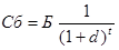 де С – сьогоднішня сума грошей, що інвестуються; d – постійна норма дисконту, що дорівнює прийнятій для інвестора нормі прибутку на капітал; t – тривалість розрахункового періоду (в роках); Сьогоднішня цінність Сб майбутніх грошей визначається таким чином: