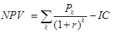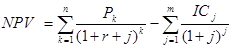 Перерахунок поточних і майбутніх сум в еквівалентній вартості шляхом дисконтування дозволяє визначити цінність проектів на основі поточних і майбутніх витрат і результатів. Підраховані за кожний рік життя проекту, вони дисконтуються, а потім підсумовуються з метою одержання загального показника цінності проекту, на основі якого роблять висновок щодо прийнятності проекту. Критерії, що використовуються в аналізі інвестиційної діяльності, можна підрозділити на дві групи в залежності від того враховується чи ні часовий параметр: 1) засновані на дисконтованих оцінках; 2) засновані на облікових оцінках. До першої групи відносяться критерії: - чистий приведений ефект (Net Present Value, NPV); - індекс рентабельності інвестиції (Probability Index, PI); - внутрішня норма прибутку (Internal Rate of Return, IRR); - модифікована внутрішня норма прибутку (Modified Internal Rate of Return, MIRR); - дисконтований строк окупності інвестиції (Discounted Payback Period, DPP). До другої групи відносяться критерії: - строк окупності інвестиції (Payback Period, PP); - коефіцієнт ефективності інвестиції (Accounting Rate of Return, ARR). а) Метод розрахунку чистого приведеного ефекту Цей метод заснований на зіставленні величини вихідної інвестиції (IC) із загальною сумою дисконтованих чистих грошових надходжень, генерованих нею протягом прогнозованого періоду. Оскільки приплив коштів розподілений у часі, він дисконтується за допомогою коефіцієнта r, встановлюваного інвестором самостійно виходячи зі щорічного відсотка повернення, який він хоче чи може мати на інвестований їм капітал. Припустимо робиться прогноз про те, що інвестиція (IC) буде генерувати протягом n років річні доходи в розмірі Р1 , Р2 , …, Рn . Загальна накопичена величина дисконтованих доходів (Present Value, PV) і чистий приведений ефект (Net Present Value, NPV= ЧДД –чистий дисконтований доход) відповідно розраховуються по формулах [49]:
