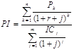 Якщо PI>1, то проект варто прийняти; якщо PI<1, то проект варто відкинути; якщо PI=1, то проект є ні прибутковим, ні збитковим. Якщо проект припускає не разову інвестицію, а послідовне інвестування фінансових ресурсів протягом m років, то формула для розрахунку PI. модифікується в такий спосіб (з врахуванням впливу інфляції як на дисконтовані потоки інвестиції, так і на сгенеровані потоки прибутку інвестиційного проекту):