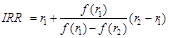 За допомогою таблиць вибираються два значення коефіцієнта дисконтування r1 <r2 таким чином, щоб в інтервалі (r1 , r2 ) функція NPV=f(r ) змінювала своє значення з “+” на “” чи з “” на “+”. Далі застосовують формулу