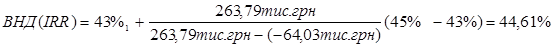 В табл. В.1 В.2 Додатку В наведені розрахунки в “електронних таблицях” EXCEL2000 послідовними приближеннями значення ВНД – внутрішньої норми доходності, тобто такого значення % зміни вартості грошей у часі, яка дозволяє вирівняти дисконтовані інвестиції та чистий дисконтований доход підприємства, тобто ВНД – досягнута фактична рентабельність капіталу. За результатами наближень табл.В.1, В.2 внутрішня норма дисконтування проекту розраховується як: