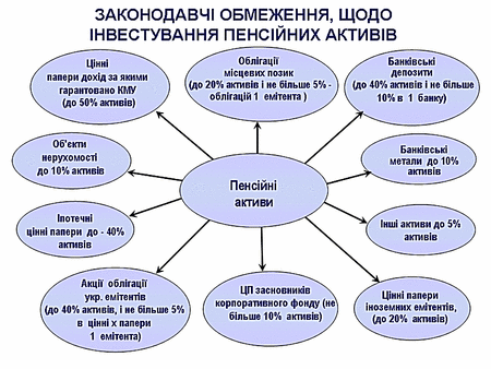 До складу активів пенсійного фонду відповідно до цього Закону належать: активи в грошових коштах; активи в цінних паперах; інші активи згідно із законодавством. Згідно ЗУ " Про недержавне пенсійне забезпечення" пенсійні активи у цінних паперах складаються з: 1) цінних паперів, погашення та отримання доходу за якими гарантовано Кабінетом Міністрів України, Радою міністрів Автономної Республіки Крим, місцевими радами відповідно до законодавства; 2) акцій та облігацій українських емітентів, що відповідно до норм законодавства пройшли лістинг та перебувають в обігу на фондовій біржі або в торговельно-інформаційній системі, зареєстрованих у встановленому законодавством порядку, обсяги торгів на яких становлять не менше 25 відсотків від загальних обсягів торгів на організаційно оформлених ринках цінних паперів України (крім цінних паперів, на які здійснюється підписка згідно із законодавством); 3) цінних паперів, погашення та отримання доходу за якими гарантовано урядами іноземних держав, при цьому встановлення вимог до рейтингу зовнішнього боргу та визначення рейтингових компаній здійснюються Державною комісією з цінних паперів та фондового ринку; 4) облігацій іноземних емітентів з інвестиційним рейтингом, визначеним відповідно до пункту 3 цієї частини; 5) акцій іноземних емітентів, що перебувають в обігу на організованих фондових ринках та пройшли лістинг на одній з таких фондових бірж, як Нью-Йоркська, Лондонська, Токійська, Франкфуртська, або у торговельно-інформаційній системі НАСДАК (NASDAQ). Емітент цих акцій повинен провадити свою діяльність не менше ніж протягом 10 років і бути резидентом країни, рейтинг зовнішнього боргу якої визначається відповідно до пункту 3 цієї частини. Активи пенсійного фонду формуються за рахунок внесків до пенсійного фонду та прибутку від інвестування пенсійних внесків. Інвестування здійснюється у різні фінансові інструменти особами які отримали ліцензії на управління активами згідно з інвестиційною декларацією, ухваленою радою недержавного пенсійного фонду, та визначеними законом інвестиційними обмеженнями. Особа, що здійснює управління активами складає інвестиційний портфель, виходячи із загальних поточних економічних умов з метою максимального примноження і збереження пенсійних активів. Пенсійні активи, що накопичуються у пенсійному фонді, можуть бути використані виключно для цілей інвестиційної діяльності фонду, виконання зобов'язань фонду перед його учасниками та оплати витрат, пов'язаних із здійсненням недержавного пенсійного забезпечення. Держава обмежує інвестиційну діяльність Недержавних пенсійних фондів.[12]
