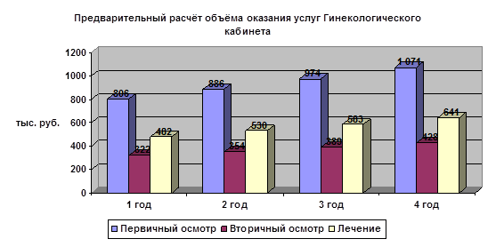 В первый год планируется проведение рекламной компании, которая будет направлена на создание первичного спроса: размещение рекламного объявления в газете 8 раз в месяц (по 10 кв. см.) в течении 3-х месяцев. Затраты: 2080 * 3 мес. = 6240 (Шесть тысяч двести сорок) рублей. На телевидении – бегущая строка 12 раз в день – 5 дней в месяц, в течении 3-х месяцев, с интервалом в 1 месяц. Затраты: 4500 ·* 3 мес. = 13500 (Тринадцать тысяч пятьсот) рублей. Общая сумма затрат на рекламу в течении трёх месяцев составит: 19740(Девятнадцать тысяч семьсот сорок рублей. 3.3 Цено вая политикаУчитывая спрос на услуги, в Амурской области проживает 25% женского населения. Обследование у гинеколога – необходимость каждой современной женщины. Данный вид медицинских услуг пользуется повышенным спросом. На рынке. где фирма является монополистом в рамках района, наценка может достигать 50-60%. Такая наценка позволяет сохранить цену, которую могут заплатить клиенты со средним достатком, так как данная группа населения является целевой. 3.4 План реализацииПлановый объём оказанных услуг, создаваемого медицинского кабинета ИП Ткачев В.И определен исходя из оценки емкости локального рынка и прогноза его увеличения (раздел 0) и анализа функционирования аналогичных объектов рынка медицинских услуг. 4. Архитектурно-планировочное решение4.1 Генплан и архитектурно-планировочные решенияСостав помещений предприятия определен исходя из его целевого назначения, с учетом конструктивных особенностей и современных требований, предъявляемых к предприятиям подобного типа. 4.2 Технологическая планировка смотрового кабинета гинекологаОдной из наиболее важных и сложных составляющих технологического проектирования гинекологического кабинета является планировка размещения оборудования. Оптимально организованная планировка, соответствующая требованиям СанПиН 5179-90 и Приложением к СниП 2.08.02-89. Требования к внутренней отделке помещений: - рекомендуемая площадь каждого из помещений - не менее 12 кв. м. - внутренняя отделка помещения должна быть выполнена в соответствии с его функциональным назначением. - стены облицовываются глазурованной плиткой или другими влагостойкими материалами на полную высоту. - полы покрываются водонепроницаемыми материалами; линолеумные покрытия не должны иметь дефектов (щелей, дыр и пр.), должны быть гладкими, плотно пригнанными к основанию. - потолки в процедурных кабинетах должны окрашиваться водостойкими (масляными и другими) красками. - рекомендуется установка 2х раковин (для мытья рук и инструментария). - следует предусмотреть в процедурном кабинете наличие приточно-вытяжной вентиляции с механическим побуждением (на первое время достаточно оконного вентилятора). При подборе оборудования, удовлетворяющего вышеперечисленным требованиям после анализа ряда коммерческих предложений выбор был сделан в пользу производственного оборудования фирм "СпецТех", "Амурстройтехнология", «Амурский строитель», ИП Бурин Т. И. Стеллажи выбраны отечественного производства с использованием оснований и стоек производства США Оборудование изготовлено из качественных, долговечных материалов, имеет привлекательный дизайн, различные конструктивные и цветовые решения. Бонусом данной фирмы стало бесплатная проектировка размещения оборудования на компьютере и выбор оптимальног