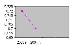 Рис.4 Среднемесячная зарплата Коэффициент роста валюты баланса: Кб = Бср1- Бср0*100%/Бср, где Бср1-Бср0 - средняя величина итога баланса за отчетный и предыдущий периоды. Кб = 29845-16182/ 16182*100%=84,43% в 2004 году. Коэффициент роста выручки от реализации продукции: Кv = (V1-V0)*100%/V0, где V1,V0 - выручка от реализации продукции за отчетный и предыдущий периоды. Кv = 50332-9614/9614=423,42% в 2004 году. По кварталам: Кv1кв2004 = 6555-7732/7732=-15,22%; Кv2кв2004 = 15113-6555/6555=130,57%; Кv3кв2004 = 13011-15113/15113=-13,91%; Кv4кв2004 = 15643-13011/13011=20,23% Данные годовой бухгалтерской отчетности за 2003 и 2004 годы свидетельствуют о достаточности собственных средств предприятия для покрытия текущих расходов. 2.3 Оценка ликвидности и платежеспособности Анализ ликвидности баланса заключается в сравнении средств по обязательствам по пассиву, которые группируются по степени срочности их погашения. Для анализа платежеспособности составляется агрегированный баланс (см. табл. №2). Из агрегированного баланса видно, что ликвидность баланса отличается от абсолютной: А1 < П1 в 2003 году, но при этом соблюдается нормальная ликвидность: А1+А2 > П1+П2 А3 > П3 А4 < П4; в 2003 и 3004 годах. 1. Коэффициент абсолютной ликвидности (стр.250 + стр.260 / стр.610 + стр.620+стр.630+стр.660), 2003 год: 150/3919=0,0383 2004 год: 2000+2435/2000+8137=0,438 отражает обеспеченность наиболее ликвидными активами для погашения текущих краткосрочных обязательств, соответствует нормальному значению от 0,2 до 0,5. 2. Коэффициент промежуточной (критической) ликвидности (стр.290-стр.210+стр.220+стр.230)/стр.610+стр.620+стр.630+стр.660), 2003 год: 15041-(12933+123)/3919=0,507; 2004 год: 29145-(17768+28+5)/2000+8137=1,120. Отражает обеспеченность ликвидными активами для погашения текущих краткосрочных обязательств, нормальное значение больше 1. 3. Коэффициент текущей ликвидности (КТЛ )- (стр.290-стр220/стр.610 +стр.620+ стр.630 +стр.660, 2003 год: 15041-123/3919=3,869; 2004 год: 29145-28/1013=2,879. Отражает обеспеченность оборотными активами для погашения краткосрочных обязательств, должен быть больше 2. 4. Коэффициент обеспеченности собственных активов оборотными средствами (стр.490 +стр.590-стр.190/стр.290, 2003 год: 4683+7580-1141/15041=0,739; 2004 год: 11887+7821-691=0,652. Устанавливает обеспеченность организации собственными средствами для пополнения оборотных средств и ведения хозяйственной деятельности , па много больше 0,1. 5. Коэффициент восстановления платежеспособности (КТЛ(кг) +6/12(КТЛ(кг) -КТЛ(нг) ) / 2,= 2,879+6/12(2,879-3,869)/2=1,192. определяет возможность восстановления организацией своей платежеспособности в течении 6 месяцев, если К > 1; 6. Коэффициент утраты платежеспособности, = 2,879+3/12(2,879-3,869)/2=1,31 определяет возможность утраты организацией своей платежеспособности в течении 3 месяцев, если К > 1. Таким образом, на конец 2004 года способность предприятия своевременно и в нужном объеме выполнять свои обязательства достигла оптимальных значений. За время своего существования предприятие повысило свою платежеспособность, и при этом низка возможность утраты платежеспособности в течении ближайших трех месяцев. 2.4 Оценка финансовой устойчивости предприятия Для оценки финансового состояния необходимо проанализировать структуру источников капитала предприятия и оценить степень финансовой устойчивости и финансового риска. С этой целью рассчитывают следующие показатели: 1. Коэффициент автономии (финансовой независимости) - (стр.490/стр.300): 2003 год = 4683/16182=0,289, 2004 год =11887/29845=0,398; отражает долю активов, покрываемых за счет собственного капитала, нор