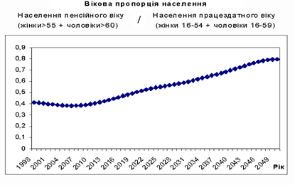 Рис.Д.2. Динаміка демографічного прогнозу співвідношення кількості пенсіонерів та працездатного населення України у 1998 – 2049 роках