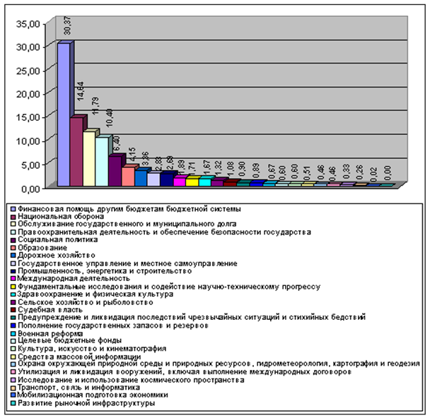 Анализ данных показывает, что среди расходов федерального бюджета все большее место занимают затраты на оказание финансовой помощи другим бюджетам бюджетной системы – 31,32%. На втором месте расходы на национальную оборону – 17,43%. И на третьем месте общегосударственные вопросы. По сравнению с прошлым годом расходы на оказание финансовой помощи другим бюджетам бюджетной системы увеличились на 0,71%. Расходы на национальную оборону увеличились на 1,96%. Все материалы взяты из источника 30. 3. Проблемы бюджетной системы и пути их решения Пока мы не решим системные проблемы - реформы бюджетной системы, образования, здравоохранения, пока не завершим банковскую, налоговую реформы, мы и в этих точечных проектах будем сталкиваться с нерешенными системными проблемами. Мы должны найти источники роста, которые не угробили бы экономику, и должны быть очень осторожны в выборе средств. (1) Наиболее острой бюджетной проблемой Президент назвал несбалансированность ресурсов и обязательств. С первой характеристикой спорить практически невозможно. Расходы на образование, культуру, медицину и т.д. по-прежнему остаются крайне небольшими. Социальные гарантии, финансирование которых по-прежнему лежит на бюджете, непосильны, и их избыточность не позволяет снижать налоги. Нечетко разграничены полномочия бюджетов различных уровней. При этом 60% налоговых доходов сосредоточены в 12 регионах; остальные же не имеют достаточной базы для финансирования своих обязательств. (2) Заложив в основу бюджетного проекта «консервативный» бюджетный прогноз, Правительство фактически проводит ненавязчивую политику сокращения бюджетных расходов. Ведь реальные доходы оказываются выше запланированных, а непроцентные расходы остаются примерно равны плану. Таким образом, реальная доля непроцентных расходов снижается, причем происходит это «мягко», без нежелательных социальных «эксцессов». Государство ограничивает потребление, не используя все бюджетные доходы для наращивания расходов. Это необходимо как для приведения бюджетных обязательств в соответствие с новой ролью государства, так и с точки зрения денежной политики — иначе бы деньги быстро обесценивались инфляцией. Бюджет остается недостаточно прозрачным. Структура расходов по-прежнему не вполне адекватна бюджетополучателям. Это не позволяет полноценно контролировать исполнение бюджета, целевое расходование бюджетных средств. Пока не совпадают суммы средств, расписанных по функциональной (на что тратятся средства) и экономической (кому средства выделяются) классификации. Примерно две трети всех средств федерального бюджета не расписаны по экономической классификации. Необходим перевод Минобороны на казначейскую систему исполнения бюджета. Иначе невозможно контролировать расходы. Вообще система финансирования армии, по мнению экспертов, слишком запутана и многоступенчата. Расшифровка военных расходов не соответствует бюджетной классификации. Для того чтобы военный бюджет стал прозрачным, требуется огромная организационная работа, и это задача должна стать приоритетной на государственном уровне. Иначе выделяемые армии деньги так и будут расходоваться неэффективно. К сожалению, бюджет остается нейтральным по отношению к реальному хозяйству. Поскольку основные средства идут на выплату долг