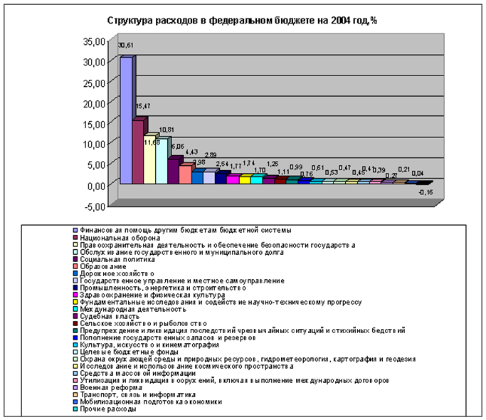 Федеральный бюджет на 2004 год был утвержден по расходам в сумме 2659447,0 млн. рублей и по доходам в сумме 2742850,4 млн. рублей, исходя из прогнозируемого объема ВВП 15300 млрд. рублей и уровня инфляции 10% (декабрь 2004 к декабрю 2003). По сравнению с прошлым годом доходы увеличились на 325058,6 млн. рублей (а это на 13,4%), а расходы увеличились на 313805,6 млн. рублей (т.е. на 13,4%). Объем ВВП увеличился на 2250 млрд. рублей (т.е. на 17,2%).