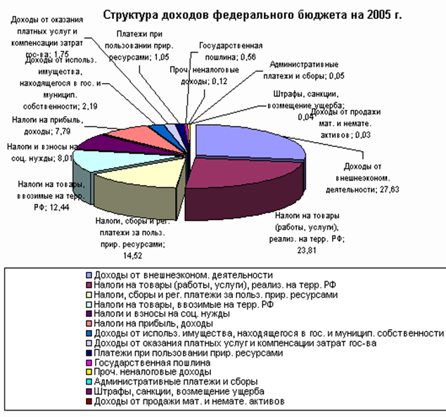 Федеральный бюджет на 2005 год был утвержден по расходам в сумме 3047929,3 млн. рублей и по доходам в сумме 3326041,1 млн. рублей, исходя из прогнозируемого объема ВВП 18720 млрд. рублей и уровня инфляции 7,5-8,5% (декабрь 2005 к декабрю 2004). По сравнению с прошлым годом доходы увеличились на 583190,7 млн. рублей (это – 21,3%), а расходы увеличились на 388482,3 млн. рублей (это – 15%). Объем ВВП увеличился на 3420 млрд. рублей (это – 22,4%). А по сравнению с 2003 годом доходы увеличились на 908249,3 млн. рублей (это – 38%), а расходы увеличились на 702287,9 млн. рублей (это – 30%). Объем ВВП увеличился на 5670 млрд. рублей (это – 43,5%).