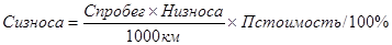 где Сизноса - сумма износа шины (одного комплекта шин) к эксплуатационной норме их пробега; Спробег - средний пробег шины (одного комплекта шин) на планируемый год; Низноса - норма износа на 1000 км пробега к стоимости шины в процентах, которая исчисляется путем деления эксплуатационной нормы пробега шин (одного комплекта шин), установленной для конкретной модели шин, на средний пробег шины (одного комплекта шин), планируемый на год; Пстоимость - первоначальная стоимость шины (одного комплекта шин). Сумма износа шин, включаемая в плановую себестоимость, определяется путем умножения количества шин по каждой модели на сумму износа шин на 1 км нормативного и сверхнормативного пробега. Сумма износа шин на 1 км нормативного и сверхнормативного пробега исчисляется следующим образом: