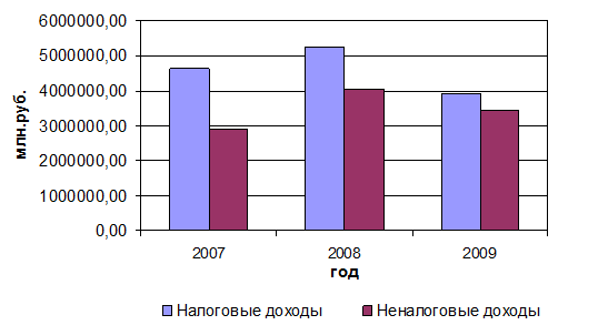 По данным таблицы мы видим, что за рассматриваемый период удельный вес налоговых доходов превышал удельный вес неналоговых доходов. Однако, в 2009 году наблюдается резкое снижение налоговых доходов в абсолютной величине с 5 231 785,21 млн. руб. в 2008 году до 3 895 641,85 млн. руб. в 2009 году, что связано с последствиями финансово-экономического кризиса. Динамику роста доходной части федерального бюджета РФ за 2007-2009 гг. представим на рисунке 2.1.1.