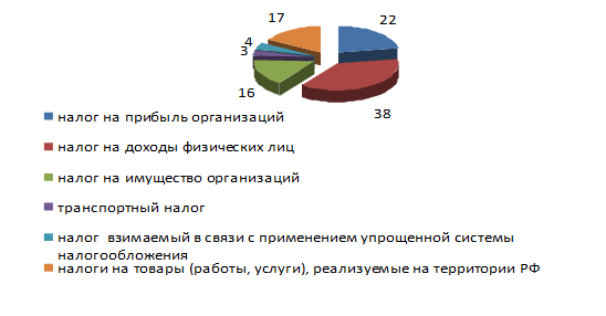 Рис. 2.2.3. Структура налоговых доходов бюджета Пензенской области за 2009 год Структура поступлений прямых налогов в бюджет Пензенской области за 2009 год показывает, что наибольший удельный вес занимает налог на доходы физических лиц – 38 процентов. Затем следует налог на прибыль организаций - 22 процента всех поступлений, косвенные налоги – 17 процентов, налог на имущество организаций – 16 процентов, налог, взимаемый в связи с применением упрощенной системы налогообложения – 4 процента, и транспортный налог – 3 процента. Мы видим, что на рисунке не отображаются налог на игорный бизнес, налоги, сборы и регулярные платежи за пользование природными ресурсами, единый сельскохозяйственный налог и государственные пошлины, это связано с тем, что доля поступлений от данных налогов незначительна и в совокупности составляет менее 0,5 процента. Наглядно представим структуру основных налоговых доходов трех изучаемых регионов за 2009 год на рис. 2.2.4.