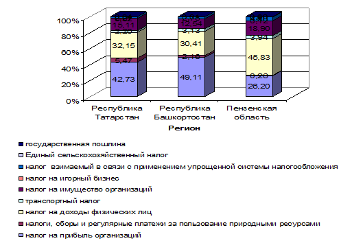 Рис. 2.2.4. Структура налоговых доходов бюджетов Республики Татарстан, Республики Башкортостан и Пензенской области за 2009 год На рисунке видно, что основную долю доходных источников всех трех регионов составляют налог на прибыль и налог на доходы физических лиц, но если в бюджете РТ и РБ преобладает первый, то в Пензенской области наоборот наблюдается преобладание налога на доходы физических лиц. Это говорит о том, что в данной области налоговые отчисления граждан являются основным источником поступлений. Необходимо отметить, что удельный вес налога на имущество в общей доле поступления от прямых налогов Пензенской области заметно выше, чем в республиках. Итак, рассматривая структуру доходной части бюджетов Республики Татарстан, Республики Башкортостан и Пензенской области можно сделать вывод о том, что в Республике Татарстан и Башкортостан преобладают поступления по налоговым доходам, а в Пензенской области безвозмездные поступления, поэтому она является дотационным регионом. Поступления налоговых доходов Республики Татарстан и Республики Башкортостан примерно на одном уровне, а в Пензенской области меньше почти в 6 раз. Наибольший удельный вес в структуре налоговых доходов в Республики Татарстан и Республики Башкортостан занимает налог на прибыль организаций, в Пензенской области – налог на доходы физических лиц. В ходе проделанной работы мы увидели, что мировой экономический кризис сильно задел экономику недотационных регионов, таких как Республика Татарстан и Республика Башкортостан. В 2009 году в данных регионах существенно возросла доля безвозмездных поступлений, и снизились поступления по налоговым доходам, особенно по таким как налог на прибыль, налог на доходы физических лиц и т.д. 3. Пути увеличения доходов бюджетов всех уровней за счет прямых налогов 3.1 Зарубежный опыт формирования доходной базы бюджетов всех уровней за счет прямых налогов Каждое государство, исходя из экономических реалий и своего понимания эффективности социальной политики, определяют долю прямых и косвенных налогов в национальной налоговой системе, в бюджетной системе. В большинстве развитых стран сложилась вполне сопоставимая структура налоговых поступлений, которая остается достаточно устойчивой на протяжении десятилетий. В одних странах, к примеру, во Франции, Италии, Ирландии, Греции и Испании, предпочтение отдается косвенным налогам. В других государствах, например, в Голландии, Дании, Люксембурге и Австрии, преобладают прямые налоги. Примерное равное соотношение прямых и косвенных налогов можно встретить в Финляндии и Германии. В США акцент в системе налогообложения делается на взимание налогов с граждан. Аналогичная ситуация наблюдается и в Канаде, Австралии. Противоположная ситуация сложилась в Японии, где бремя налогов сосредоточено на корпорациях. В Дании и Швеции преобладает обложение доходов граждан [Тютюрюков, с.77]. Наибольшее значение в формировании доходов бюджетной системы США в настоящее время имеют прямые налоги: налоги на личные доходы (индивидуальный подоходный налог), целевые отчисления в фонды социального обеспечения, налоги на прибыль корпораций. Персональный (личный) подоходный налог был введен в США в середине XIX века. В 1990-е годы выплаты личного подоходного налога составляли примерно 8% ВВП стран