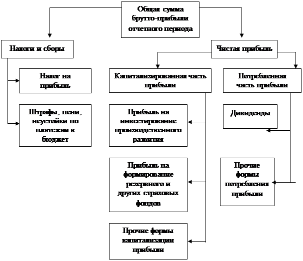 Рисунок 1 * Источник: [22; C. 346] Из представленного рисунка видно, что одна ее часть в виде налогов и сборов поступает в бюджет государства и используется на нужды общества. Оставшаяся сумма – чистая прибыль – используется на выплату дивидендов, на расширение производства, создание резервного капитала и др. Для собственников предприятия важен конечный финансовый результат – чистая прибыль, которую они могут изымать в виде дивидендов или реинвестировать с целью расширения масштабов деятельности и упрочения своих рыночных позиций. Для кредиторов размер чистой прибыли, который остается собственнику, не представляет интереса. Их больше интересует общая сумма прибыли до уплаты процентов и налогов, поскольку из нее они получают свою часть за ссуженный капитал. Государство же интересует прибыль после уплаты процентов до вычета налогов, ток как именно она служит источником поступления денег в бюджет. [23; C. 278] Помимо фондов, сформированных за счет прибыли, составной частью собственного капитала предприятия является добавочный капитал, который по своему финансовому происхождению имеет разные источники формирования: - эмиссионный доход, т. е. средства, полученные акционерным обществом – эмитентом при продаже акций сверх их номинальной стоимости; - суммы дооценки основных средств, возникающие в результате прироста стоимости имущества при проведении его переоценки по рыночной стоимости; - курсовая разница, связанная с формированием уставного капитала, т. е. разность между рублевой оценкой задолженности учредителя (участника) по вкладу в уставный капитал, оцененному в учредительных документах в иностранной валюте, исчисленной по курсу ЦБ РФ на дату поступления суммы вкладов, и рублевой оценкой этого вклада в учредительных документах. Кроме этого, предприятия могут получать средства для осуществления мероприятий целевого назначения от вышестоящих организаций и лиц, а также из бюджета. Бюджетная помощь может выделяться в форме субвенций и субсидий. Таким образом, уставный капитал и дополнительно формируемые в процессе работы предприятия собственные источники финансирования (финансовых ресурсов) образуют его собственный капитал. Собственный капитал выражает остаточность прав собственника на имущество предприятия и его доходы. Предприятие не может покрыть свои потребности только за счет собственных источников. Это связанно с особенностями движения денежных потоков, при которых моменты поступления платежей за товары и услуги на предприятие не совпадают со сроками погашения обязательств предприятия, могут возникать непредвиденные задержки платежей. Дополнительная потребность в источниках финансирования может быть также обусловлена инфляцией, когда поступающие на предприятие в виде выручки от реализации средства обесцениваются и не могут обеспечить возросшую в связи с повышением цен на сырье и материалы потребность предприятия в денежных средствах. Кроме этого, расширение деятельности предприятие требует вовлечения дополнительных ресурсов. Таким образом, появляются заемные и привлеченные источники финансирования. В состав привлеченных финансовых ресурсов включают кредиторскую задолженность за товары, работы, услуги, а также все виды текущих обязательств предприятия по расчетам: - сумма авансов, полученных о