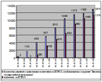 При этом наибольшее количество записей, потерянных на местном уровне после конвертации, составили следующие записи: -о регистрации с присвоением ОГРН – 8017; - о внесении изменений, не связанных с изменениями в учредительных документах– 32900; - о представлении сведений о регистрации в ФСС– 11341. Общее число записей, потерянных на местном уроне, посчитать не предоставляется возможным. Сравнительный анализ отчета «1-ЮР», сформированного в базах данных ЕГРЮЛ местного и регионального уровней, до конвертации и после показал следующее. По состоянию на 01.09.2007 количество юридических лиц - на местном уровне – 50670, - на региональном – 47892, расхождение на 2778. По состоянию на 01.10.2007 количество юридических лиц - на местном уровне - 51116, - на региональном уровне – 47440, расхождение составило – 3676. Увеличение расхождений между БД местного и регионального уровней в сведениях о количестве юридических лиц (отчет «1-ЮР») и записях, внесенных в ЕГРЮЛ (отчет «Статистика») - это результаты проведенной конвертации. В ходе сравнительного анализа отчета «Сведения о государственной регистрации юридических лиц» (сведения о количестве записей, внесенных в ЕГРЮЛ), сформированного в базах данных ЕГРЮЛ местного и регионального уровней на 01.01.2008 видно, что ситуация не улучшилась, хотя разработчиками в версии 2.4.470.07 от 17.12.2007 доработаны режимы конвертации с учетом выявленных замечаний. В инструкциях к версии содержится информация об исправляющих командах для БД ЕГР, в том числе в части исправления ссылок по Федеральному закону № 83-ФЗ (в случае обнаружения некорректного состояния лица, ликвидированного по 83-ФЗ). Скрипты, направленные разработчиками, не позволяют в полном объеме решить проблемы, возникшие после конвертации. Федеральный закон от 02.07.2005 № 83-ФЗ «О внесении изменений в Федеральный закон «О государственной регистрации юридических лиц и индивидуальных предпринимателей» и в статью 49 Гражданского кодекса Российской Федерации», вступивший в силу 6 июля 2005 года, регламентирует процедуру исключения недействующих юридических лиц по решению регистрирующего (налогового) органа из ЕГРЮЛ. В течение 2007 года территориальными налоговыми органами Алтайского края на постоянной основе проводится работа по выявлению недействующих юридических лиц, подлежащих исключению из государственного реестра, составлены соответствующие списки. В течение 2007 года налоговыми органами Индустриального района принято решений о предстоящем исключении по 617 юридическим лицам, сведения для публикации направлены в журнал «Вестник государственной регистрации», исключено из ЕГРЮЛ по решению регистрирующего (налогового) органа 771.Всего было принято решений о предстоящем исключении по 1007, что составляло 104,5% от задания ФНС, исключено из ЕГРЮЛ 980 недействующих юридических лиц. Всего с даты вступления в силу Федерального закона № 83-ФЗ территориальным налоговыми органами Алтайского края принято решений о предстоящем исключении по 12975 (137,7% от задания ФНС) недействующим юридическим лицам, исключено из ЕГРЮЛ 11376. В результате проводимой работы по ликвидации юридических лиц через процедуру банкротства, по ФЗ-83, добровольной ликвидации разрыв количества юридических лиц в ЕГРН и ЕГРЮЛ за истекший год сокращен с 11589 до 6282, в Индустриальном районе с1153 до 724. Наилучшие показатели – в ЕГРЮЛ содерж