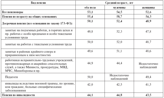 3.1 Нормативный и фактический пенсионный возрастДля российской пенсионной системы принципиальным является вопрос о фактическом возрасте выхода на пенсию и о масштабном распространении досрочного выхода на пенсию. Изменения в российском пенсионном законодательстве, а также методология статистики ПФРФ не позволяет дать ясного и исчерпывающего ответа на вопрос, сколько нынешних пенсионеров вышли на пенсию досрочно и насколько фактический возраст выхода на пенсию ниже общего. Ответ на этот вопрос дают данные выборочных социологических [20, с.47]. Согласно этим данным, средний возраст оформления пенсии - 53,1 лет (см. табл.3.2). Мужчины оформляют пенсию в среднем в 54,5 лет, а женщины в 52,6 лет. Фактический возраст выхода на пенсию, следовательно, почти на 2,5 года ниже общего у женщин и на 5,5 лет у мужчин. Таблица 3.2 Средний возраст назначения пенсии в зависимости от ее основания, респонденты-пенсионеры, лет