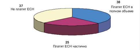Рис.3.2 Неформальная занятость, теневая занятость и информированность о пенсионной реформе Одновременно это означает, что "полноценными" участниками пенсионной системы являются наиболее высокооплачиваемые застрахованные работники, поскольку размер заработной платы с возрастом повышается. Таким образом, если взять всех не-пенсионеров - трудоспособных и пенсионных возрастов - за 100%, то совсем не платят ЕСН (по причине занятости в армии, МВД и пр., или нелегальной занятости) 32%, платят его хотя бы с части своей зарплаты - 27% и, наконец, скорее всего, уплачивают налог со всего заработка - 41%. Основной контингент плательщиков находится при этом в возрастах 40 лет и старше. В целом по нашим оценкам доля вероятных плательщиков ЕСН составляет 63%, в том числе 38% - тех, кто не имеет устных договоренностей об оплате труда, то есть платят ЕСН в полном объеме (см. рис.3.3).