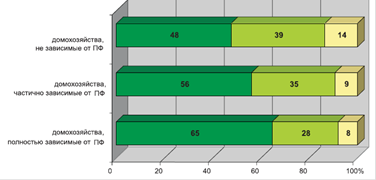Рис.3.6. Коэффициент замещения (отношение средней пенсии к средней заработной плате) в 1998–2004 гг., % Тем не менее, положительная динамика пенсионных выплат населению в последние годы не позволяет считать, что реформа может обеспечить российским пенсионерам достойный уровень жизни. Реальное материальное положение пенсионеров зависит не только от размера пенсии, но и от целого ряда других факторов - наличия других источников доходов, в первую очередь, работы, социальных пособий и льгот, структуры домохозяйства, в состав которых они входят, доходов других членов домохозяйства. В России преобладают домохозяйства смешанного типа, в которых представлены многопоколенные семьи. Условно их можно разделить на три группы: • домохозяйства, полностью зависимые от ПФ, т.е. те, в которых все его члены являются пенсионерами; • домохозяйства, полностью независимые от ПФ, т.е. те, в состав которых не входят пенсионеры; • домохозяйства, частично зависимые от ПФ, т.е. те, в состав которых входят как пенсионеры, так и не-пенсионеры [13, с.123]. Сравнивая материально-имущественные параметры этих трех групп, нетрудно заметить, что в наихудшем экономическом положении оказываются семьи пенсионеров. При ответе на вопрос "Насколько Вам легко сводить концы с концами? " 65% из них дают самый пессимистический вариант ответа "с большим трудом". В двух других группах доля пессимистических ответов ощутимо ниже (см. рис.3.7).