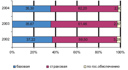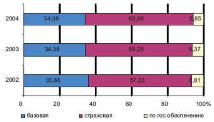 Рис.3.9. Структура средней трудовой пенсии в 2002-2004 гг., %.