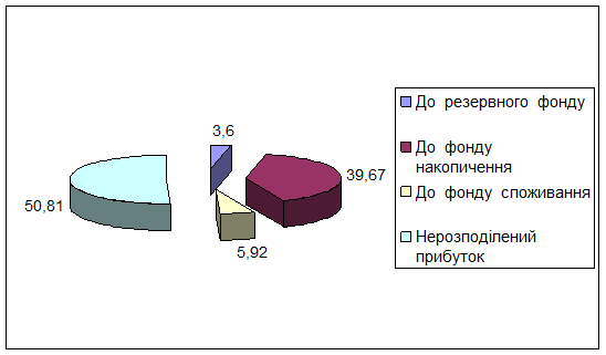 Графічно структуру розподілу прибутку зображено на Рисунку 2.7 Як видно з рисунку 2.7, більш 50% чистого прибутку залишилося нерозподіленою. Частка відрахувань до фонду накопичення складає 39,67% від чистого прибутку, це дозволяє нам зробити висновок про те, що керівництво „КФ „Ольга” планує розширювати діяльність, а саме, збільшувати основні і оборотні фонди, освоювати нові види товарів.
