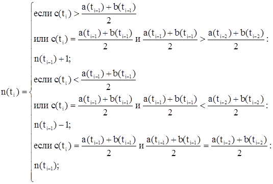 Рис. 1 На рис. 1 точка А определяет незаконченный ИПС размером 2 сделки. Через некоторое время САЛК должно либо увеличиться (сплошная линия), либо уменьшиться (пунктирная линия), и незаконченный ИПС станет законченным. В текущий момент времени точно определить направление дальнейшего изменения САЛК нельзя. Обозначим вероятности повышения и понижения САЛК в конце ИПС как, соответственно, Рр(a,b,c) и Pn(a,b,c).Переменные a, b и с являются параметрами ИПС как законченных, так и незаконченных. Для определения значений Рр(a,b,c) и Pn(a,b,c) по завершению ИПС, вначале рассмотрим упрощенный случай. Будем считать, что текущий момент времени соответствует моменту завершения ИПС, и следующая сделка вызовет изменение САЛК. Найдем вероятности повышения и понижения САЛК в конце законченного ИПС определенного размера. Обозначим эти вероятности как, соответственно, Ррас(a,b,c) и Pnас(a,b,c). Предлагается ввести понятие рыночного направления на ИПС, определяемого следующим образом: если большинство сделок в ИПС было заключено по ценам выше значения САЛК, то рыночное направление в ИПС является аккумулированием, если цены большинства сделок ИПС ниже значения САЛК, рыночное направление в ИПС - диссипация. При этом если цена заключенной сделки больше САЛК при аккумулировании или меньше САЛК при диссипации, считается, что эта сделка совершена по рыночному направлению. Если цена заключенной сделки меньше САЛК при аккумулировании или больше САЛК при диссипации, то считается, что эта сделка совершена против рыночного направления. Кроме этого каждый ИПС предлагается характеризовать тремя количественными параметрами: “a”, “b”, и “c”, от которых зависят величины вероятностей Ррас(a,b,c) и Pnас(a,b,c). Параметр “а” представляет собой количество сделок в ИПС, совершенных по рыночному направлению. Параметром “b” обозначается количество сделок, совершенных против рыночного направления. Используя принятые определения, можно сказать, что при выполнении условия a>b в рассматриваемом ИПС существует различаемое рыночное направление. Это может быть аккумулирование или диссипация. Однако если выполняется равенство a=b, можно считать, что в данном интервале явное рыночное направление отсутствует. Размер ИПС, выраженный в количестве заключенных в течение него сделок, равен сумме значений а и b. Параметр “с” описывается зависимостью величины индикатора “Trade Volume Index New” (далее TVIN) от числа заключенных сделок в конце ИПС. Индикатор TVIN рассчитывается следующим образом: