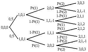 Линиями с наклоном вверх, обозначены сделки, совершаемые в направлении аккумулирования. Линии с наклоном вниз обозначают сделки, совершенные в направлении диссипации. Возле каждой линии указаны вероятности совершения соответствующей ей сделки.