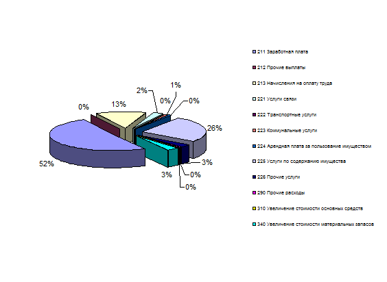 Рисунок 1 Динамика расходов Отделения за 2003-2005 гг Как видно из данных диаграммы, в 2004 году произошел рост расходов по сравнению с 2003 годов на 73%. В 2005 году рост расходов был незначительным, они увеличились на 238,2 тыс.рублей, что составило 7,6 % от расходов 2004 года. Чтобы исследовать факторы, повлиявшие на увеличение расходов на содержание аппарата отделения, проанализируем расходы отделения за 2005 год в разрезе экономической структуры расходов и сравним их с такими же показателями расходов за 2003-2004гг (Рисунок 2). Как видно из данных рисунка 2 наибольший удельный вес в общей доле расходов на содержание отделения составляют расходы на заработную плату. В 2005 году они составили 1661,6 тыс. рублей (52% от общей суммы расходов). Начисления на оплату труда были произведены в сумме 421 тыс. рублей. Другой объемной статьей расходов является получение услуг, в частности, услуг на содержание имущества. Данная статья составляет 26% от общего объема расходов (844,4 тыс.рублей). Расходы на услуги связи в отделении произведены в сумме 80 тыс.рублей, что составляет 2% от общей суммы расходов.