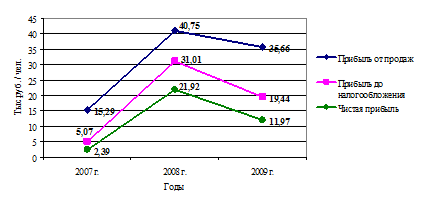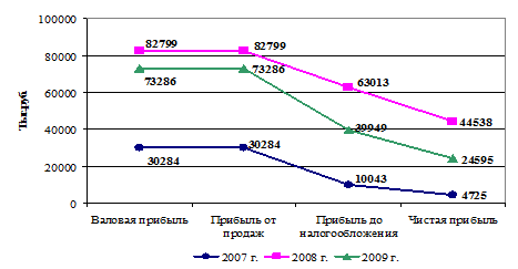 Представленные в таблице 2.3 данные показывают, что наибольший удельный вес в структуре доходов приходится на валовую прибыль, равную 4,38% в 2007 г., с увеличением ее доли до 6,19% к 2009 г., как и предполагалось по плану. Это свидетельствует о приоритетности основной деятельности, за счет которой и формируется чистая прибыль. Доля прочих доходов в диапазоне 0,01 - 0,2% за анализируемый период 2007 – 2009 гг. говорит о том, что даже значительные колебания величины прочих доходов не оказывают существенного влияния на конечный результат деятельности ООО «Автозаводстрой». Из данных структурно-динамического анализа за три года следует, что все показатели, кроме прочих доходов (снижение их составило 1031 тыс.руб.), имели положительную динамику. Совокупные доходы в абсолютном выражении увеличились на 477683 и на 15215 тыс. руб. соответственно, темпы прироста составили 69,14 и 1,3% соответственно; валовая прибыль в 2008 г. прибавила 52515 или 173,41 %, однако в 2009 году сумма снижения валовой прибыли составила 9513 тыс. руб. или 11,49%. Начиная с этого показателя, наблюдается снижение показателей прибыли С в 2009 году. Для большей наглядности представим динамику прибыли ООО «Автозаводстрой» за период 2007 – 2009 гг. на рисунке 2.3.