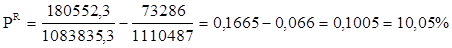 где PR – резерв роста рентабельности; Пф – фактическая сумма прибыли; РП – резерв роста прибыли от продаж; СВ – возможная себестоимость продукции с учетом выявленных резервов; Иф – фактическая сумма затрат по реализованной продукции. Подставив все известные данные в формулу (3.6), вычислим резерв увеличения рентабельности производственной деятельности ООО «Автозаводстрой» за счет действия названных выше факторов: