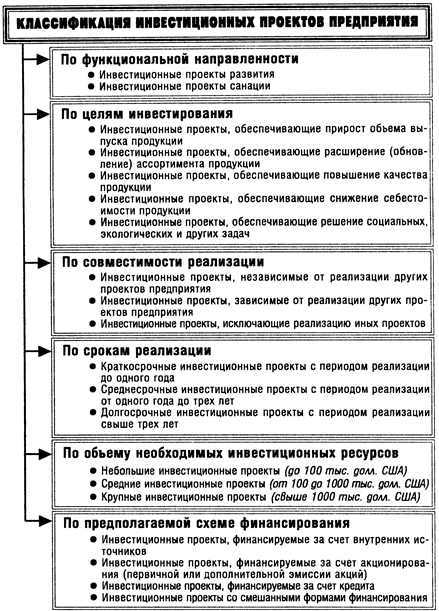 Рис. 1.1 Классификация инвестиционных проектов предприятия по основным признакам. В зависимости от видов инвестиционных проектов, изложенных в рассматриваемой их классификации, дифференцируются требования в их разработке. Для небольших инвестиционных проектов, финансируемых предприятием за счет внутренних источников, обоснование осуществляется по сокращенному кругу разделов и показателей. Такое обоснование может содержать лишь цель осуществления инвестиционного проекта, его основные параметры, объем необходимых финансовых средств, показателей эффективности осуществляемых инвестиций, а также схему (календарный план) реализации инвестиционного проекта. Для средних и крупных инвестиционных проектов, финансирование реализации которых намечается за счет внешних источников, необходимо полномасштабное обоснование по соответствующим национальным и международным стандартам. Такое обоснование инвестиционных проектов подчинено определенной логической структуре, которая носит унифицированный характер в большинстве стран с развитой рыночной экономикой (отклонения от этой общепринятой структуры вызываются лишь отраслевыми особенностями и формами осуществления реальных инвестиций). В соответствии с рекомендациями ЮНИДО (Организации Объединенных Наций по Промышленному Развитию) инвестиционный проект должен содержать следующие основные разделы: 1) Краткая характеристика проекта (или его резюме). В этом разделе содержатся выводы по основным аспектам разработанного проекта после рассмотрения всех альтернативных вариантов, когда концепция проекта, ее обоснование и формы реализации уже определены. Ознакомившись с этим разделом, инвестор должен сделать вывод о том, отвечает ли проект направленности его инвестиционной деятельности и инвестиционной стратегии, соответствует ли он потенциалу его инвестиционных ресурсов, устраивает ли его проект по периоду реализации и срокам возврата вложенного капитала и т.п. 2) Предпосылки и основная идея проекта. В этом разделе перечисляются наиболее важные параметры проекта, которые служат определяющими показателями для его реализации, рассматриваются регион расположения проекта в увязке с рыночной и ресурсной средой, приводится график реализации проекта и характеризуется его инициатор. 3) Анализ рынка и концепция маркетинга. В нем излагаются результаты маркетинговых исследований, обосновывается концепция маркетинга и разрабатывается проект его бюджета. 4) Сырье и поставки. Этот раздел содержит классификацию используемых видов сырья и материалов, объем потребности в них, наличие основного сырья в регионе и обеспеченности им, программу поставок сырья и материалов и связанные с ними затраты. 5) Местоположение, строительный участок и окружающая среда. В этом разделе подробно описываются месторасположение проекта, характер естественной окружающей среды, степень воздействия на нее при реализации проекта, социально-экономические условия в регионе и инвестиционный климат, состояние производственной и коммерческой инфраструктуры, выбор строительного участка с учетом рассмотренных альтернатив, оценка затрат по освоению строительного участка. 6) Проектирование и технология. Этот раздел должен содержать производственную программу и характеристику производственной мощ