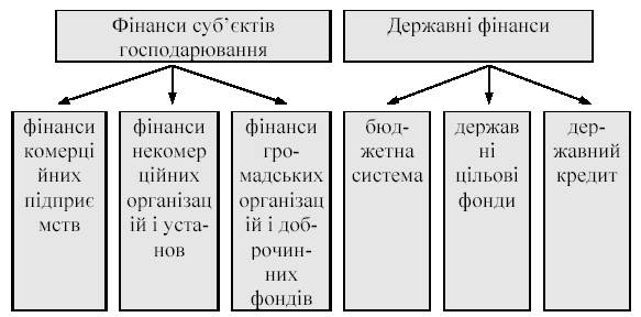 Рис. 1. Склад фінансової системи України Всi фiнансовi вiдносини в залежностi вiд ролi суб'єктiв у суспiльному виробництвi можна подiлити на такі сфери: 1) фiнанси суб'єктів господарювання; 2) державнi фiнанси. Але всерединi кожної сфери, конкретизуючи характер дiяльностi суб'єктiв, видiляються окремi ланки фiнансових вiдносин. Так, наприклад, в складi фiнансiв суб'єктів господарювання це: 1) фiнанси комерційних пiдприємств; 2) фiнанси некомерцiйних органiзацiй i установ; 3) фiнанси громадських органiзацiй i доброчинних фондiв. Крiм того, в таких ланках фiнансової системи як фiнанси комерцiйних пiдприємств, фiнанси некомерцiйних органiзацiй i установ, можна продовжити подiл в залежностi вiд галузевої ознаки i за формами власностi. Всi сфери i ланки фiнансової системи iснують взаємопов'язано, але центральне мiсце серед них займають бюджети. Бюджети пов'язанi зi всiма iншими ланками i об'єднують фiнансову систему в єдине цiле. Принципи побудови фiнансової системи:1) єднiсть, яка обумовлена єдиною економiчною i полiтичною основою суспiльства, єдиною фiнансовою полiтикою, що реалiзується в життя через фiнансову систему; 2) функцiональне призначення ланок виражається в тому, що в кожнiй з них вирiшуються свої завдання специфiчними методами, iснують вiдповiднi фонди грошових коштiв, апарат управлiння. Загальнодержавним фiнансам притаманнi, крiм того, принципи демократичного централiзму i нацiональної полiтики, якi яскраво проявляються в побудовi державних фiнансових органiв, а також бюджетної системи. Фінанси комерційних підприємств мають особливості організації обумовлені специфікою їх діяльності. Підприємства працюють на засадах комерційного розрахунку, який передбачає отримання прибутку (доходу), відшкодування за рахунок власних коштів всіх затрат по основній діяльності, а також по її розширенню і розвитку. Такі підприємства працюють, головним чином, в сфері матеріального виробництва. Але в сучасних умовах переходу до ринку і в сфері нематеріального виробництва деякі організації будують свою діяльність на засадах комерції (лікувальні, видавницькі, навчальні заклади тощо). Комерційні підприємства є основними платниками податків в бюджет, таких як податок на прибуток, податок на додану вартість, акцизний збір, ресурсні платежі, а також внесків в державні цільові фонди. Таким чином, за рахунок частини створеної комерційними підприємствами вартості при її перерозподілі через бюджети ці кошти спрямовуються на утримання установ невиробничої сфери (бюджетних організацій). До некомерційних установ належать такі, які надають послуги, виконують роботи безкоштовно або за символічну плату, яка не відшкодовує їх видатків. Це лікарні, поліклініки, школи, дитячі дошкільні установи, музеї, середні і вищі навчальні заклади та ін. Таким чином, принципова відмінність комерційних підприємств від некомерційних полягає у тому, що метою перших є одержання прибутку, а для других такаціль не є головною. Крім того, для некомерційних організацій у випадках перевищення доходів від усіх видів діяльності та з усіх джерел над видатками, одержані вільні кошти не можуть бути спрямовані на збільшення доходів тих юридичних або фізичних осіб, які заснували таку некомерційну організацію, а повинні використовуватись на розвиток діяльності, створення фінансових резервів тощо. Більшість некоме