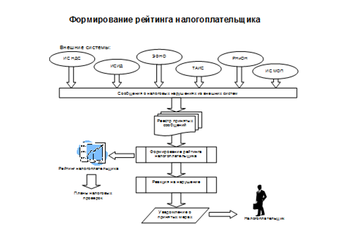 Рисунок №4 После принятия сообщения о налоговом нарушении, в ИС ЭКНА выполняется автоматический анализ принятого сообщения, в соответствии с критериями оценки. Каждое выявленное налоговое нарушение может быть отнесено к одной из групп: ФЛК; камеральный контроль; отдельные сведения (систематическая убыточность, низкий коэффициент налоговой нагрузки и другие). Для анализа нарушений используется система формирования рейтинга – степени «тяжести» нарушения. Следует различать две составляющие рейтинга налогоплательщика: рейтинг по налоговым нарушениям; коэффициент приоритета, выставляемый по регистрационным данным (по умолчанию равен 1). Рейтинг по налоговым нарушениям из различных информационных систем для каждого налогоплательщика суммируется. Наряду с рейтингом налогоплательщика, рассчитывается предполагаемая сумма доначислений по акту налоговой проверки, на основе сообщений из внешних информационных систем о суммах отклонений, выявленных в формах налоговой отчетности. Алгоритм расчета предполагаемых сумм доначислений следующий: · на основе информации, переданной внешней информационной системой, определяется форма налоговой отчетности, в которой установлены нарушения; · на основе справочных данных, позволяющих определить ставку налога по коду формы налоговой отчетности, рассчитывается предполагаемая сумма доначислений, равная произведению суммы отклонения на ставку налога. Высокие показатели рейтинга отражаются в реестре «Рейтинг налогоплательщиков на проверку» – это реестр, из которого в дальнейшем будут выбраны налогоплательщики в план налоговых проверок. Под планом налоговых проверок понимается документ, в соответствии с которым производится контрольная работа налогового органа. Формирование плана проверок, осуществляется путем выбора налогоплательщиков по максимальному рейтингу, формируемому на основе налоговых нарушений. [17] В соответствии с организационной структурой налогового органа, планы могут составляться несколькими отделами. Особенностью составления плана различными отделами является то, что при помощи справочника «Налоговые нарушения, контролируемые отделами» план может формироваться только по определенным группам нарушений.