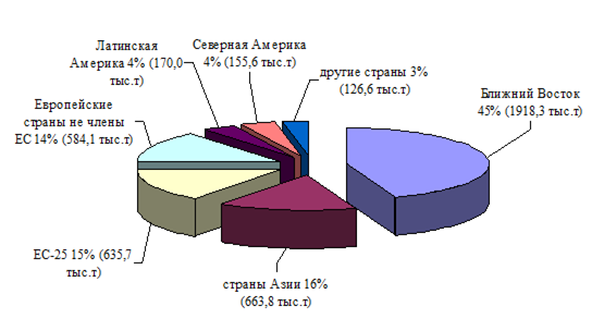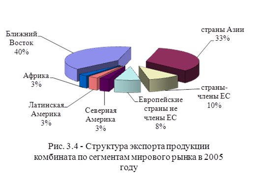 Наиболее активные страны-импортеры продукции комбината в 2005 году: Турция (доля в структуре экспорта 20,9%), Сингапур (10,65%), Сирия (7,47%), Индия (6,10%). Из произведенного товарного ассортимента в 2005 году на мировых рынках наибольшим спросом пользовались: рулон 1 сорта – 39,58% и толстый лист судостроительного назначения – 33,03%. Распределение объемов экспорта в 2005 году по сегментам мирового рынка представлено на рис. 3.5. Следует выделить следующие наиболее значимые региональные рынки сбыта продукции комбината в 2005г.: Ближний Восток, Азия и ЕС. Большая доля поставок в страны Ближнего Востока осуществлялась в: Турцию (52% от общей суммы поставок в регион или 910 тыс. т), Сирию (19% или 330 тыс. т), ОАЭ (14% или 250тыс. т), Саудовскую Аравию (4% или 51 тыс. т) и др. Товарная номенклатура экспорта в рассматриваемый регион представлена следующими видами продукции: рулоны 1 сорта (48%), толстый лист (20%).
