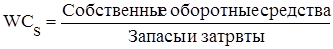 При прочих равных условиях рост показателя МК в динамике рассматривается как положительная тенденция. Приемлемое ориентировочное значение показателя устанавливается предприятием самостоятельно и зависит, например, от того, насколько высока ежедневная потребность предприятия в свободных денежных ресурсах. Доля собственных оборотных средств в покрытии запасов. Характеризует ту часть стоимости запасов, которая покрывается собственными оборотными средствами, и рассчитывается следующим образом: