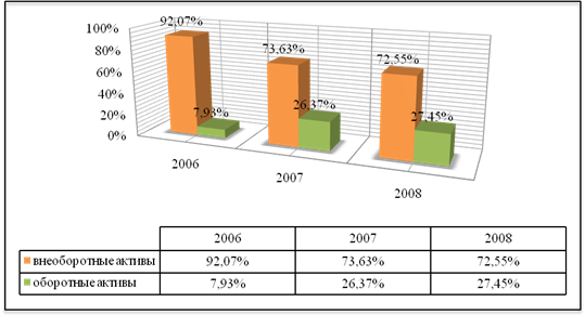 Рисунок 5 – Соотношение долгосрочных и краткосрочных обязательств Увеличение краткосрочных обязательств с 1 млн. р. до 695 млн. р. за анализируемый период произошло за счет увеличения кредиторской задолженности перед прочими кредиторами, а именно перед генподрядной организацией, которая представляет акты выполненных строительно-монтажных работ в текущем месяце за предыдущий. Эта задолженность является переходящей из месяца в месяц и зависит от суммы выданного аванса и объема выполненных работ за отчетный месяц. Задолженность по налогам и сборам в бюджет в течении анализируемого периода практически неизменна в абсолютном выражении (с 12 млн. р. в 2007 году по 16 млн. р. в 2008 году) является переходящей и краткосрочной и отражает отсутствие просроченной задолженности по платежам в бюджет. 2.2.2 Анализ размещения капитала Анализ активов предприятия Сведения о размещении капитала, имеющегося в распоряжении предприятия, содержатся в активе баланса. Каждому виду размещенного капитала соответствует определенная статья баланса. По этим данным можно установить, какие изменения произошли в активах предприятия, какую часть составляет недвижимость предприятия, а какую – оборотные средства, в том числе в сфере производства и сфере обращения (рисунок 6) [6]. Главным признаком группировки статей актива баланса считается степень их ликвидности (скорость превращения в денежную наличность). По этому признаку все активы баланса подразделяются на долгосрочные, или основной капитал (разд. I), и оборотные активы (разд. II) [12]. Средства предприятия могут использоваться как в его внутреннем обороте, так и за его пределами (дебиторская задолженность, долгосрочные и краткосрочные финансовые вложения, денежные средства на счетах в банках). Капитал может функционировать в денежной и материальной форме.