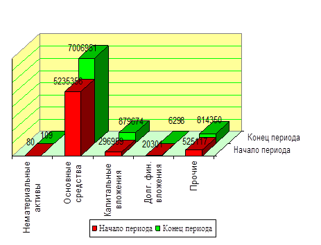Рисунок 2.5 - Динамика стоимости оборотных активовПрирост дебиторской задолженности может быть результатом увеличения товарных ссуд, выданных потребителям готовой продукции. Также он может быть связан с отсрочкой платежа дебиторов, вызван появлением просроченной задолженности, для погашения которой предприятие вынуждено привлекать дополнительные денежные средства, увеличивая кредиторскую задолженность. Краткосрочные финансовые вложения возросли на 1138 руб., но доля их в стоимости активов составляет менее 1 %. Денежные средства увеличились на 10845 руб., или на 7,75 %, что отрицательно сказывается на платежеспособности предприятия. Однако удельный вес денежных средств за анализируемый период практически не изменился и составил к концу года 1,8 %. В ходе анализа показателей структурной динамики установлено, что на конец отчетного периода 78,5 % составляют внеоборотные активы и 21,5 % - текущие активы. В составе внеоборотных активов наибольшую долю занимают основные средства (80 %); в составе оборотных активов - запасы и затраты (21%), дебиторская задолженность (40 %). В целом структура хозяйственных средств на конец года несколько улучшилась, и произошедшие изменения можно оценить положительно, хотя следует обратить внимание на невысокий удельный вес денежных средств в составе оборотных активов и значительное отвлечение средств в запасы и дебиторскую задолженность. Таким образом, за отчетный год наблюдалось увеличение стоимости имущества предприятия. Темп прироста мобильных средств (43,3 %) оказался выше, чем внеоборотных активов (42,84 %), что определяет тенденцию к ускорению оборачиваемости наиболее ликвидных средств предприятия. После общей оценки имущественного состояния предприятия следует изучить состояние, движение и причины изменения основных видов имущества, установить оборачиваемость хозяйственных средств. Создание материально-производственных запасов является необходимым условием обеспечения непрерывного производственно-коммерческого процесса. Величина запасов может составлять значительный удельный вес не только в составе оборотных средств, но и в активе предприятия. Запасы должны быть оптимальными. Излишние запасы приводят к необоснованному отвлечению средств из хозяйственного оборота, что в конечном итоге влияет на рост кредиторской задолженности и является одной из причин неустойчивого финансового положения. Недостаток запасов может привести к сокращению объема производства продукции и уменьшению суммы прибыли, что также влияет на ухудшение финансового состояния предприятия. Состояние запасов может быть охарактеризовано с помощью таблицы 2.2. Как видно из таблицы, запасы товарно-материальных ценностей в целом повысились за анализируемый период на 217906 руб., или на 71,4 %. Увеличение запасов имело место по всем видам материальных оборотных средств, кроме товаров отгруженных. Основной прирост запасов произошел по сырью и материалам, сумма которых возросла на 209259 руб., или на 86,2%. Затраты в незавершенном производстве увеличились на 14918 руб. Одновременно возросли запасы готовой продукции прирост которых составил 1583 руб. (14,7%). Расходы будущих периодов остались неизменны. Анализ структурной динамики показывает, что наибольший удельный вес в составе запасов занимают остатки сырья и материалов, доля которых повы