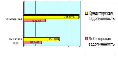 Как свидетельствуют данные выше приведенной таблицы, на предприятии наблюдается тенденция увеличения кредиторской задолженности. Более половины объема кредиторской задолженности (55,3 % и 69 %) составляют обязательства перед поставщиками за товары, работы и услуги. Сумма этих долгов возросла по сравнению с началом года на 817021 руб., или почти в 92,6 % раза. Сумма полученных авансов увеличилась на 55875 руб., что составило 29 % прироста. Возросла задолженность прочим кредиторам на 58920 руб. (36,4 %). По оплате труда задолженность уменьшилась на 60979 руб. (35 %), государственным внебюджетным фондам на 10446 руб. (26 %). Проведем сравнительный анализ дебиторской и кредиторской задолженности. Значительное превышение кредиторской задолженности над дебиторской создает угрозу финансовой устойчивости предприятия. Превышение дебиторской задолженности над кредиторской означает отвлечение средств из хозяйственного оборота и может привести в дальнейшем к необходимости привлечения дорогостоящих кредитов банков и займов для обеспечения текущей производственно-хозяйственной деятельности предприятия. Следовательно, от того, насколько соответствуют предоставленные и полученные объемы кредитования, зависит финансовое благополучие предприятия. Для сравнения сумм дебиторской и кредиторской задолженностей и темпов их роста за отчетный период используют данные бухгалтерского баланса, представленные в графической интерпретации, рисунок 2.9.