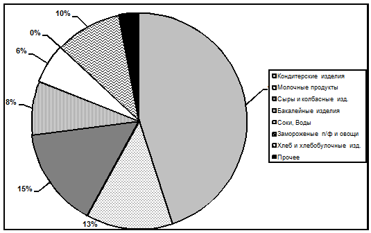 Рис. 4.1. Структура товарооборота ООО магазин «Мария Ра» за 2006 г. Хлеб и хлебобулочные изделия составили в 10% в 2006 году и 8% в 2007-м. Прослеживается заметная тенденция снижения потребления кондитерских изделий и хлеба и рост потребления молочных продуктов. Снижение уровня продаж сыров и колбасных изделий связано с ростом цен на данный вид продукции в 2007 году в целом по стране. В 2007 году в ООО магазин «Мария Ра» был произведен ремонт, после чего введен отдел по продаже замороженных полуфабрикатов и овощей. Замороженные овощи и полуфабрикаты поступают от крупных Московских поставщиков производящих данный вид продукции – Микояновского мясокомбината, Останкинского мясокомбината, ТФ «Золотой петушок».